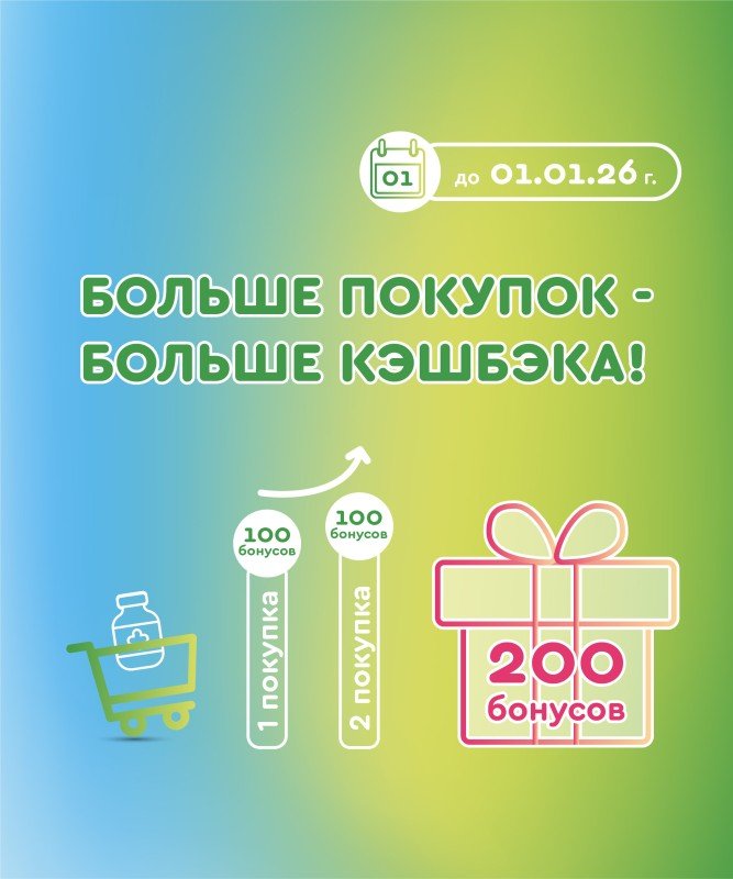 - За первую покупку вы получите 100 бонусов, за вторую — еще 100 (всего до 200 бонусов).
